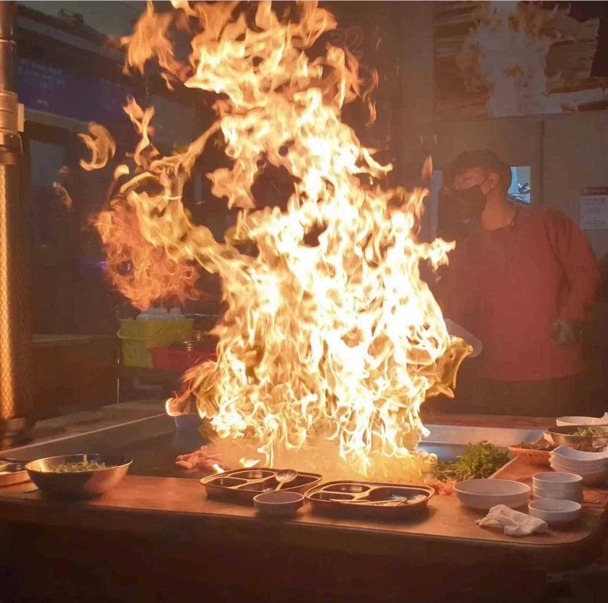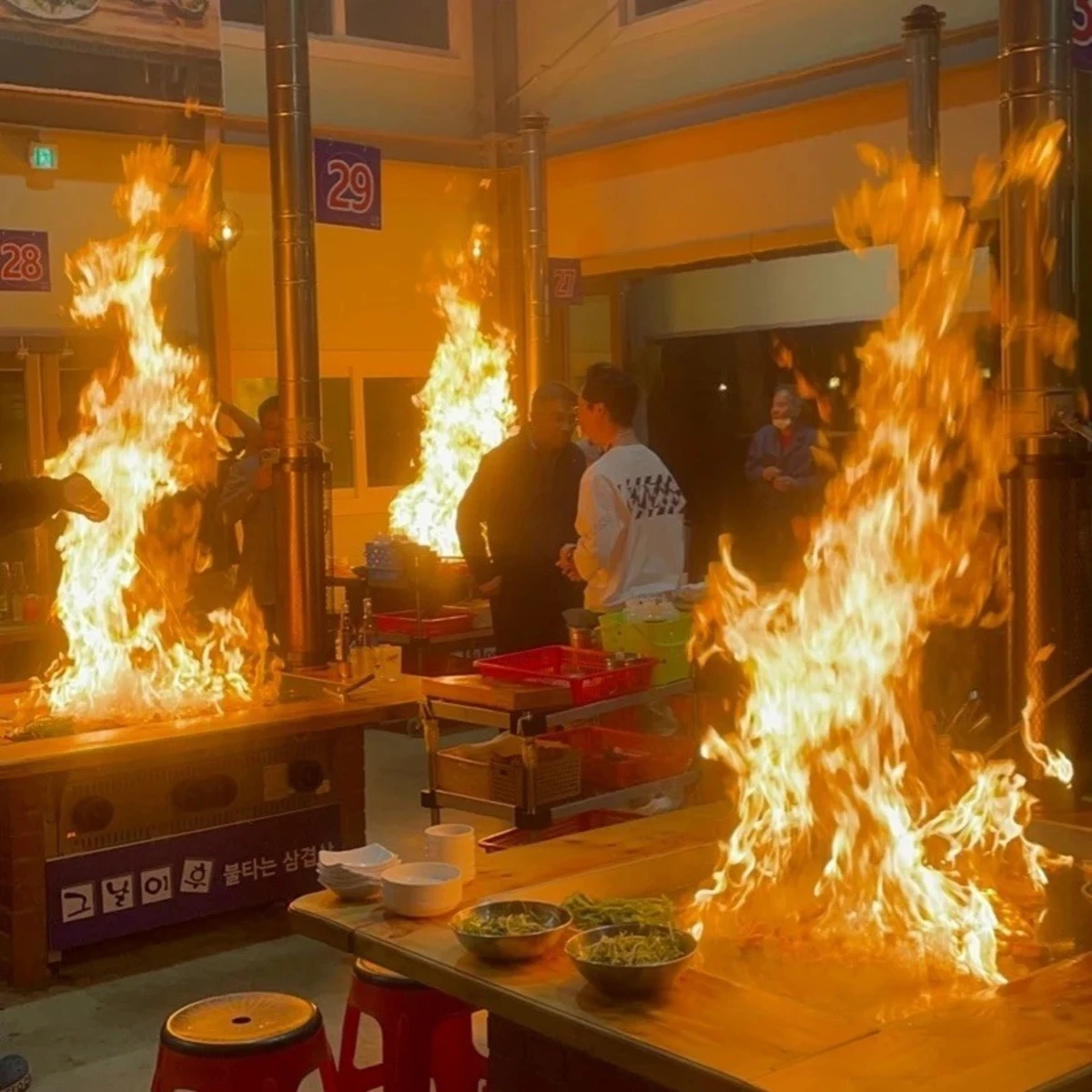 지글지글 철판 위에 구워지는 삼겹살, 불꽃과 함께하는 이색 퍼포먼스를 직접 경험해보시기 바랍니다.